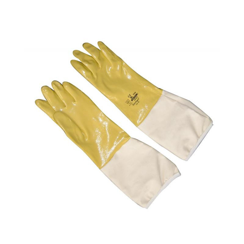 Guanti Acqua Stop. La mano è formata da un soffice tessuto ricoperto da “nitrile”, un prodotto impermeabile che li rende molto maneggevoli e praticamente a prova di puntura, completi di manicotto.