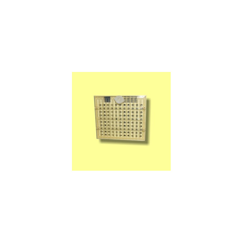 Uno piastra alveolata,rappresentante 110 alveoli di covata femminile,sui quali verranno applicati 110 cupolini(forniti a parte su richiesta),a forma di alveolo,con una riserva di candito per l'introduzione di regine estranee all'arnia(1);
