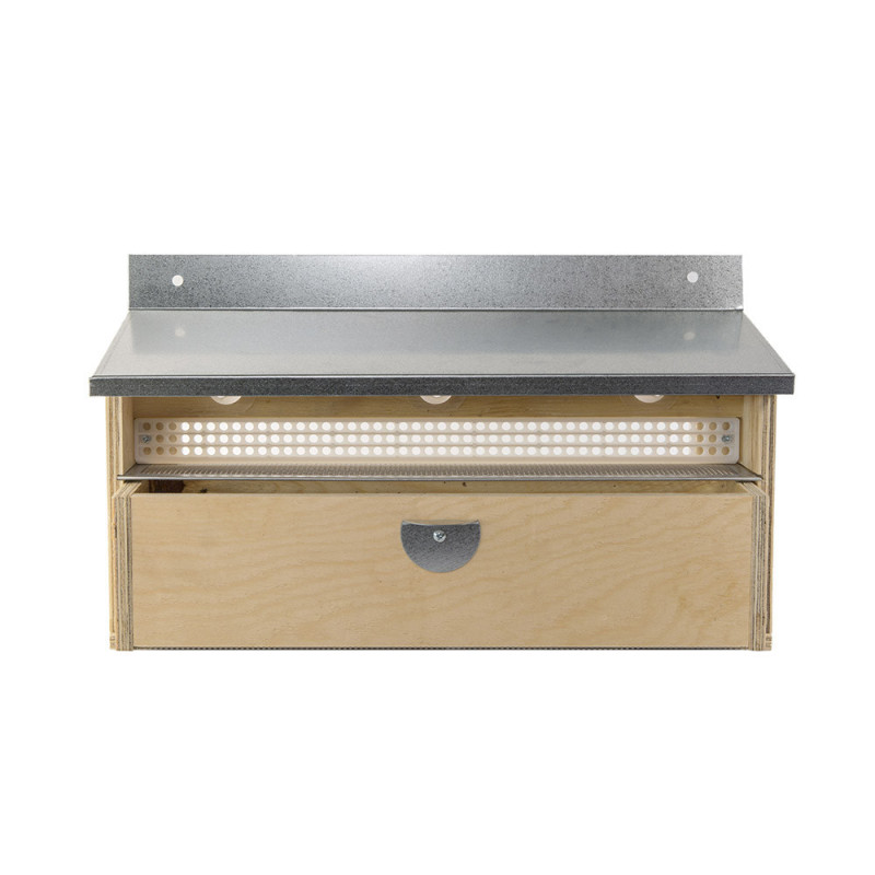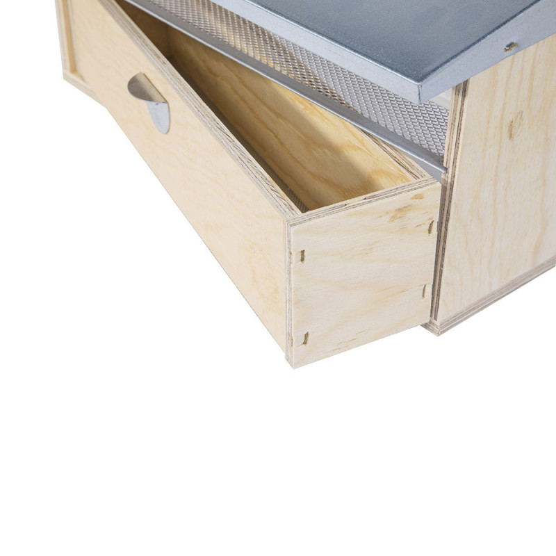 Arnia con perimetro in abete rosso listellare, fondo avvitato, rete anti varroa zincata, vassoio, distanziatori zincati dentati 7 favi, maniglie zincate imbullonate, angolari e porticina zincati di qualità avvitati, coprifavo, tetto puntato.