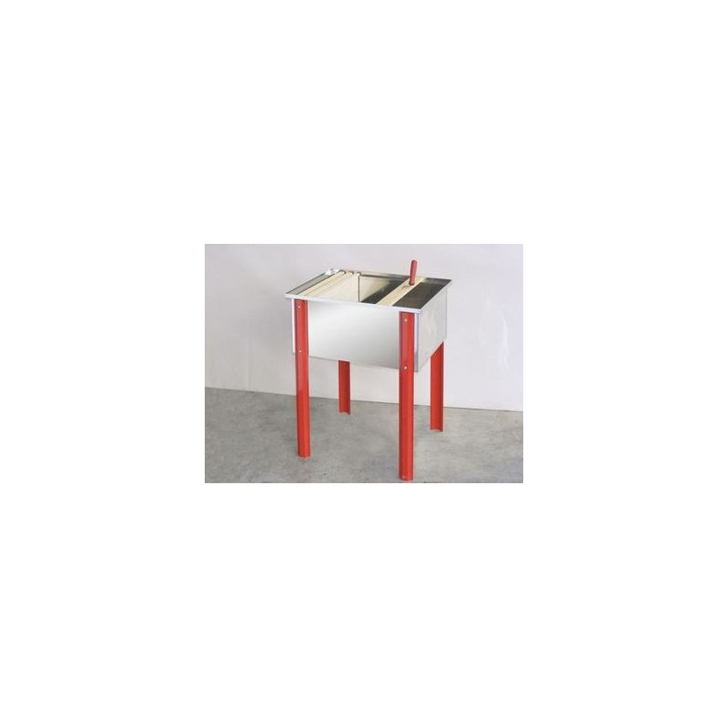 Banchino per disopercolare in acciaio inox, con vasca 65x48x30 cm, completo di coperchio, sgocciolatoio, traversa in legno come appoggio per il favo e porta-coltello, rubinetto ø 40 mm in plastica e 4 robuste gambe smontabili.(non conprende il leggio)
