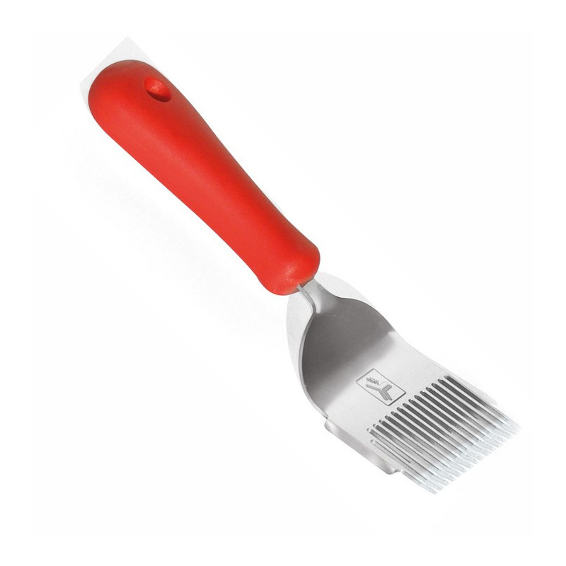 Forchetta disopercolatrice interamente in acciaio INOX tagliato al laser, con raschietto laterale e manico ergonomico in plastica.