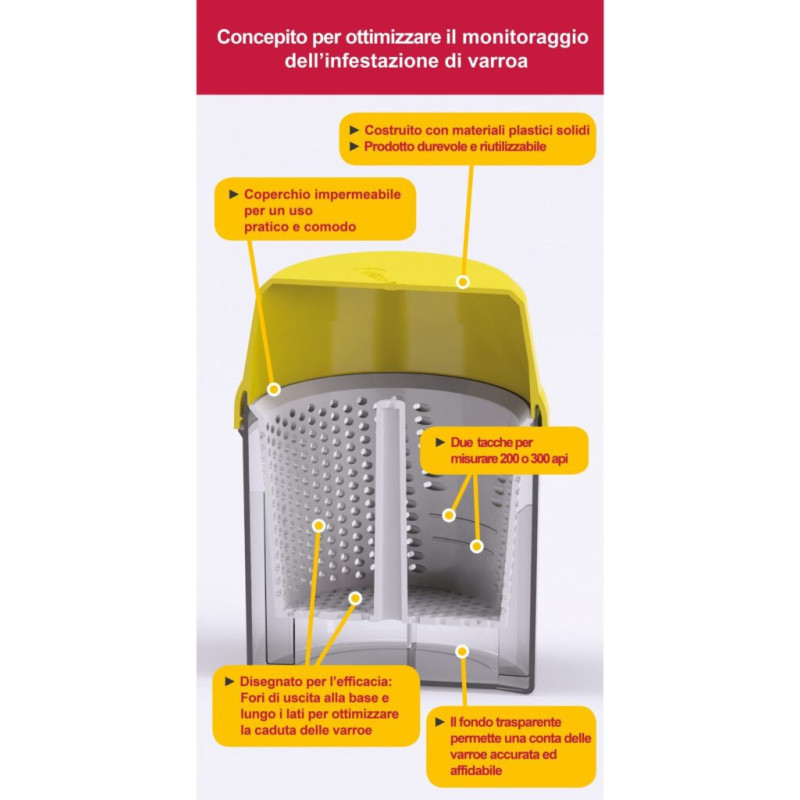 Sistema di monitoraggio della varroa, facile, veloce e affidabile. Questa operazione è importante e serve per evitare di raggiungere liveli di infestazioni critici.Il dispositivo è costrutito con materiali plastici solidi, durevoli e riutilizzabili.Si consiglia di prelavare il campione di api direttamente utilizzando il recipiente trasparente. Separare le varroe dalle api utilizzando zucchero a velo agitando il recipiente chiuso per 60 secondi: A questo punto si procederà alla conta delle varroe cadute sul fondo del contenitore e òe api potranno essere rimesse in libertà.